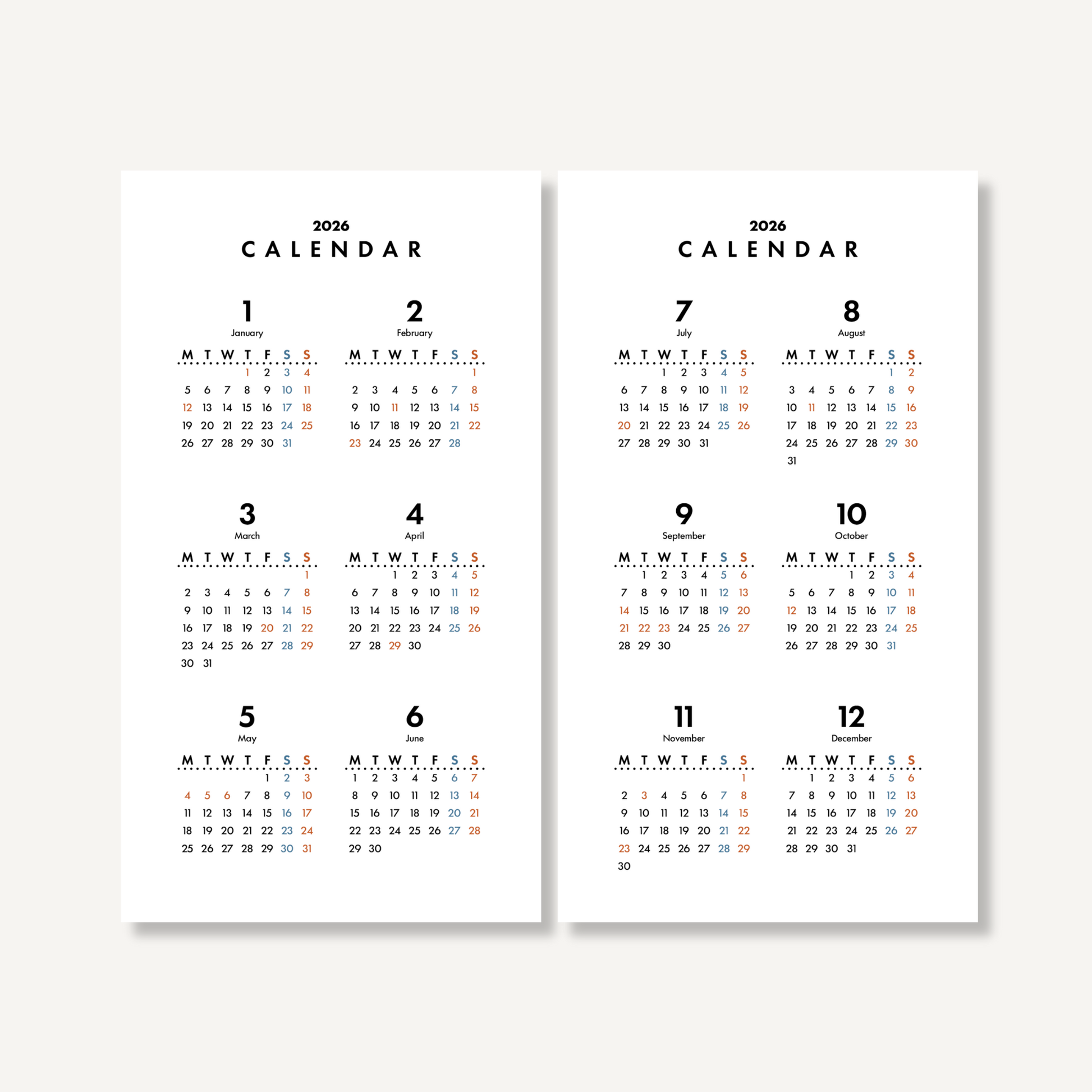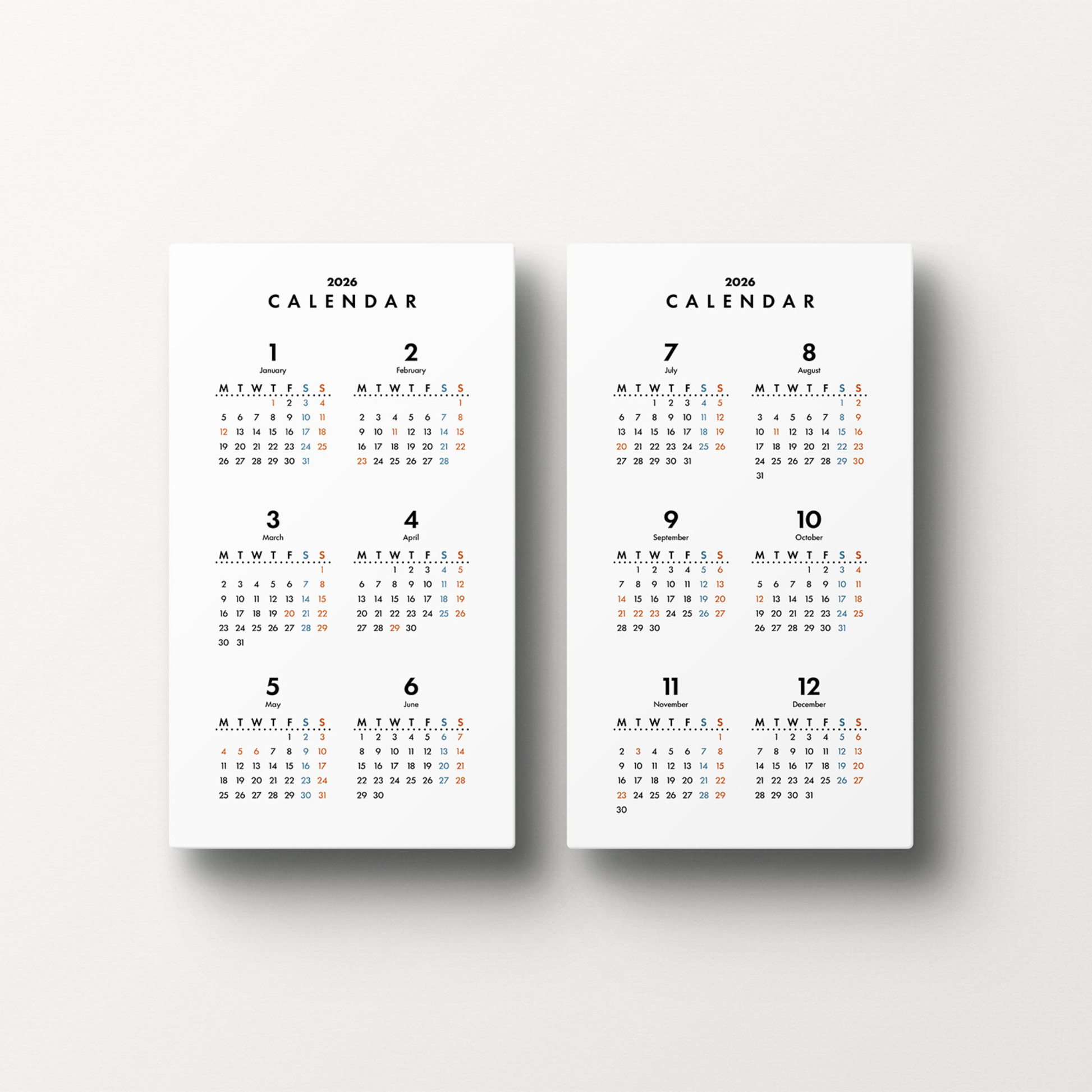 ◽️内容:見開きタイプ年間カレンダー|スタンダード(2026年1月〜12月)